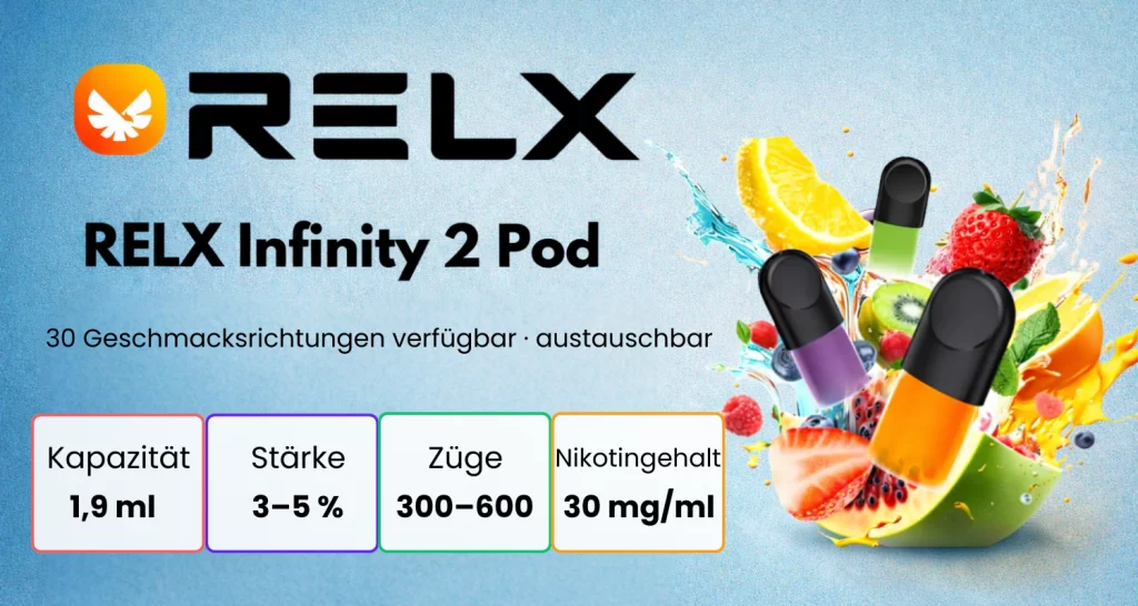 RELX Infinity 2 Device, E-Liquids, Ladehüllen sowie über 30 Geschmacksrichtungen der RELX Pod Pro 2. Alle Produkte sind offiziell original und werden innerhalb von 24 Stunden versendet.